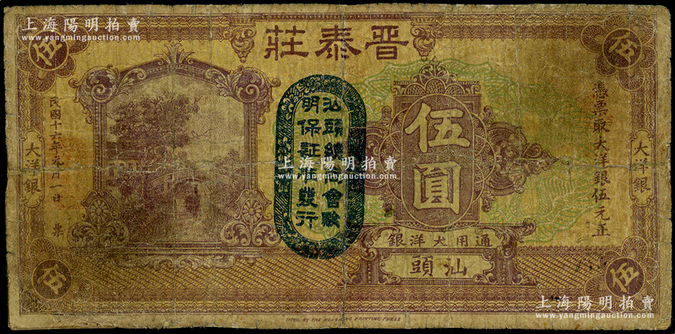 民国十六年(1927年)晋泰庄大洋银伍圆,汕头地名,上盖“汕头总商会验明保证准发行”戳记,有修补,近七成新