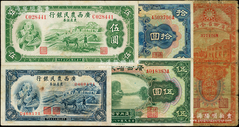 广西省钞5种,详分:广西省银行1929年伍圆、拾圆,广西省金库国币库券1934年南宁壹圆,广西农民银行1938年壹圆、伍圆;其中2枚有修补,六至八五成新