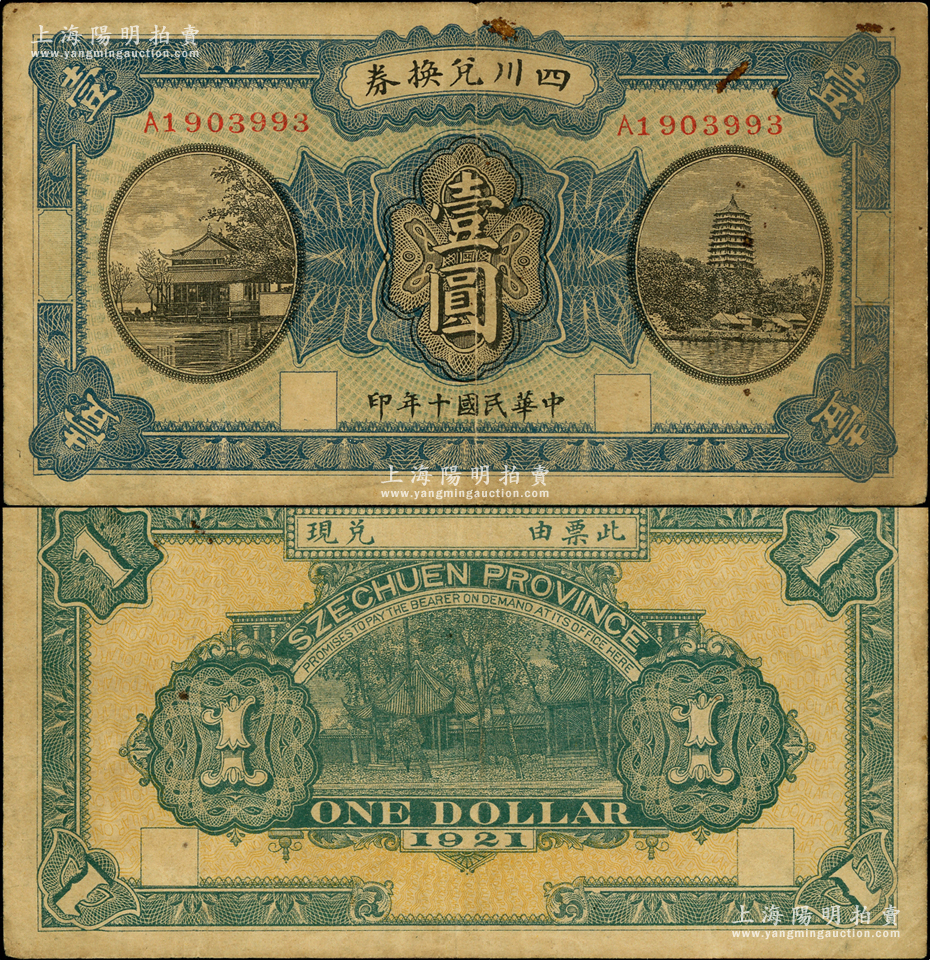 民国十年(1921年)四川兑换券壹圆,属无职章、地名和无加字票,甚属奇特;海外藏家出品,少见,原票七成新