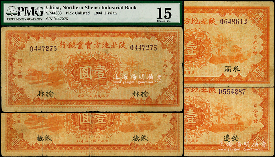 民国廿三年(1934年)陕北地方实业银行壹圆共4种,分别为安边、米脂、绥德、榆林地名券,属军阀井岳秀氏所发行;其中1枚有评级,原票七成新