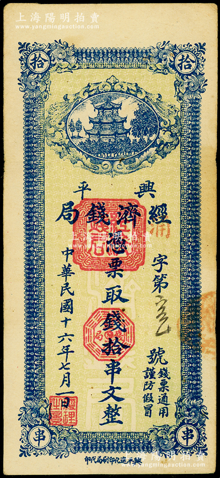 民国十六年七月(1927年)兴平经济钱局蓝色拾串文,兴平进化印刷局代印,上印楼阁图,少见,八成新