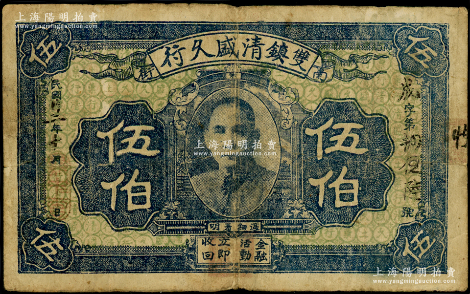 民国廿三年(1934年)双镇清盛久行伍伯,似为陕西安康洵阳县(今称旬阳)民间钞票,上印孙中山像,背印城景图,少见且属首度公诸于阳明,原票七五成新