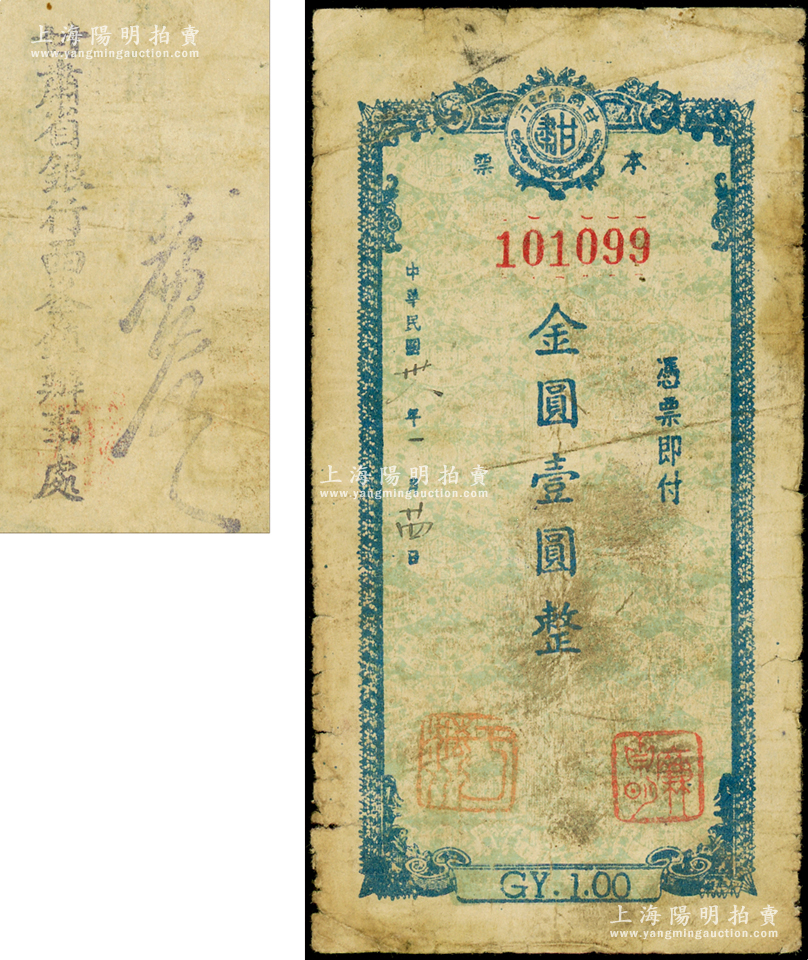 民国卅八年(1949年)甘肃省银行本票金圆壹圆,背盖“甘肃省银行西峰镇办事处”和负责人签名戳记,少见,原票近七成新
