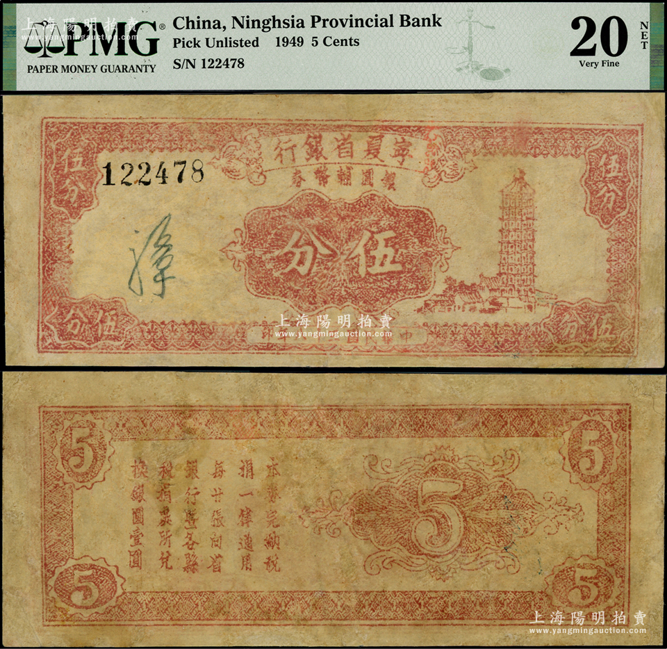 民国三十八年(1949年)宁夏省银行银圆辅币券伍分,属省钞之珍罕品种,乃首度公诸于阳明,PMG 20 VF NET