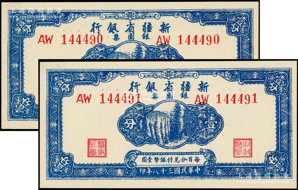 民国三十八年(1949年)新疆省银行银圆票壹分共2枚连号,资深藏家出品,全新