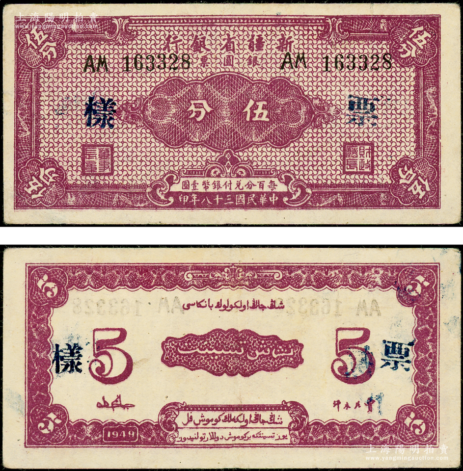 民国三十八年(1949年)新疆省银行银圆票伍分,正票改作票样,少见,八五成新