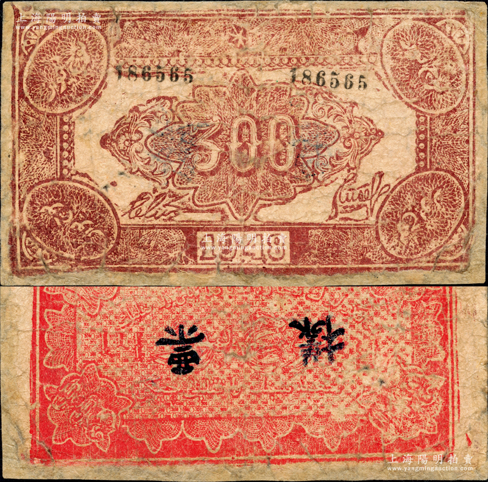 1948年新疆商业银行伊犁分行期票叁佰圆,正面棕色/背面红色印刷,且手盖“票样”,由新疆三区革命政府所发行;平山堂藏品,罕见,有修补,六成新