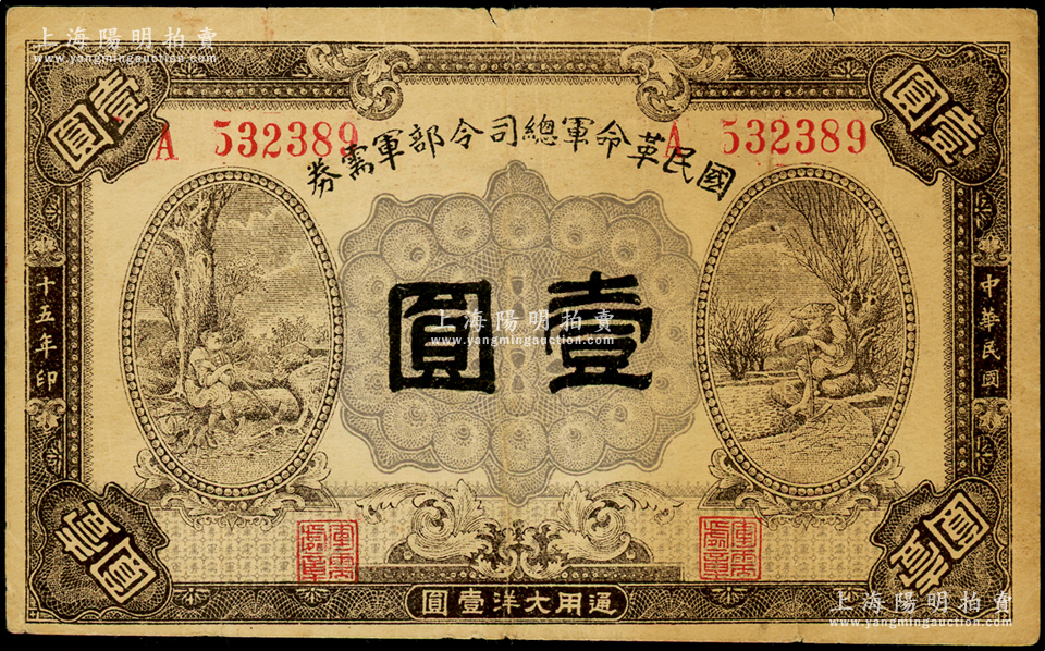 民国十五年(1926年)国民革命军总司令部军需券壹圆,背印国民革命军总司令蒋中正签名之布告,乃属北伐战争军票,原票七五成新