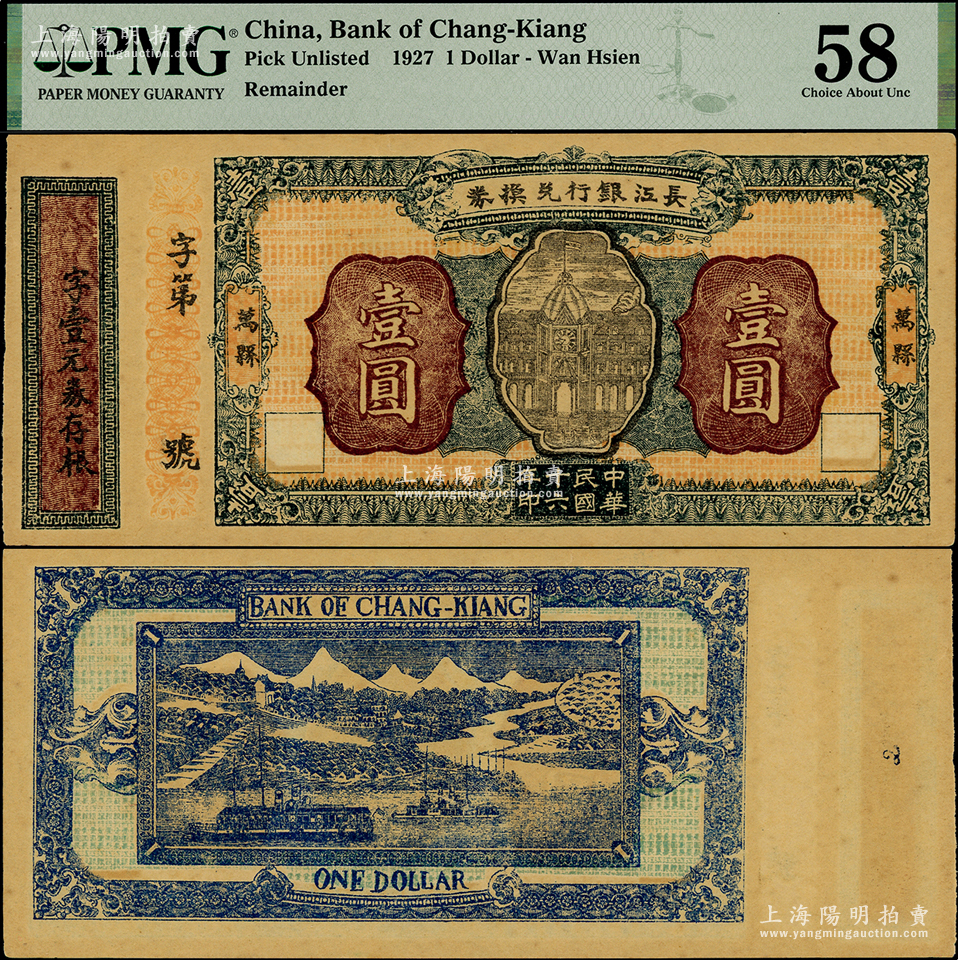 民国十六年(1927年)长江银行兑换券壹圆,万县地名;该行由四川军阀杨森所创建,其纸币发行于万县等地,属四川纸币之少见品,九五成新