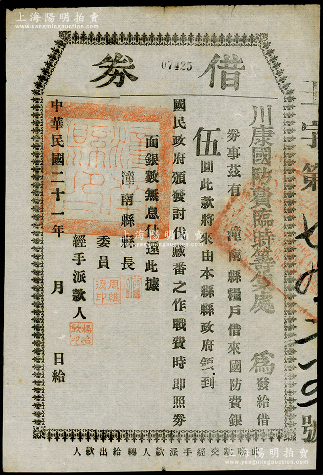 民国二十一年(1932年)川康国防费临时筹集处“借券”,由粮户借来国防费伍圆,上印“讨伐藏番之作战费”等字样,发行于潼南县;此乃第二次川康战争之历史见证,时西藏在英国的支持下,大举东犯西康,经川军刘文辉等部奋起反击,至1933年签订《青藏停战协定》,形成西康与西藏以金沙江为界的局面;少见且历史意义厚重,八成新