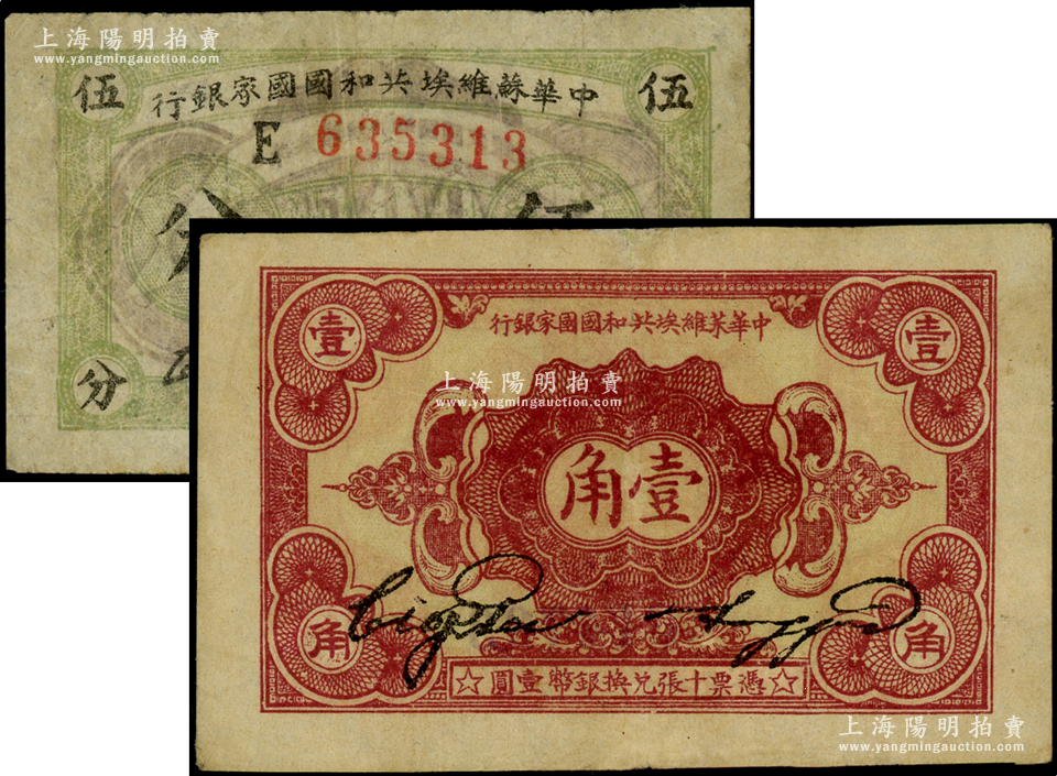 1932年中华苏维埃共和国国家银行伍分、壹角共2枚不同,分别为B字轨和E字轨,七至八成新