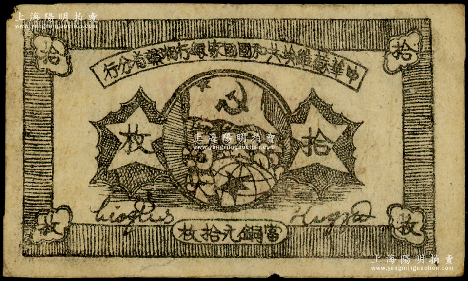 1934年中华苏维埃共和国国家银行湘赣省分行拾枚,其背面号码为C字轨,近八成新