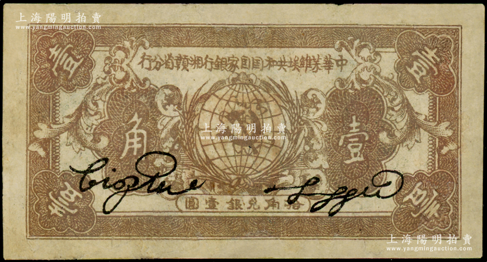 1934年中华苏维埃共和国国家银行湘赣省分行壹角,D字轨,有修补,七五成新
