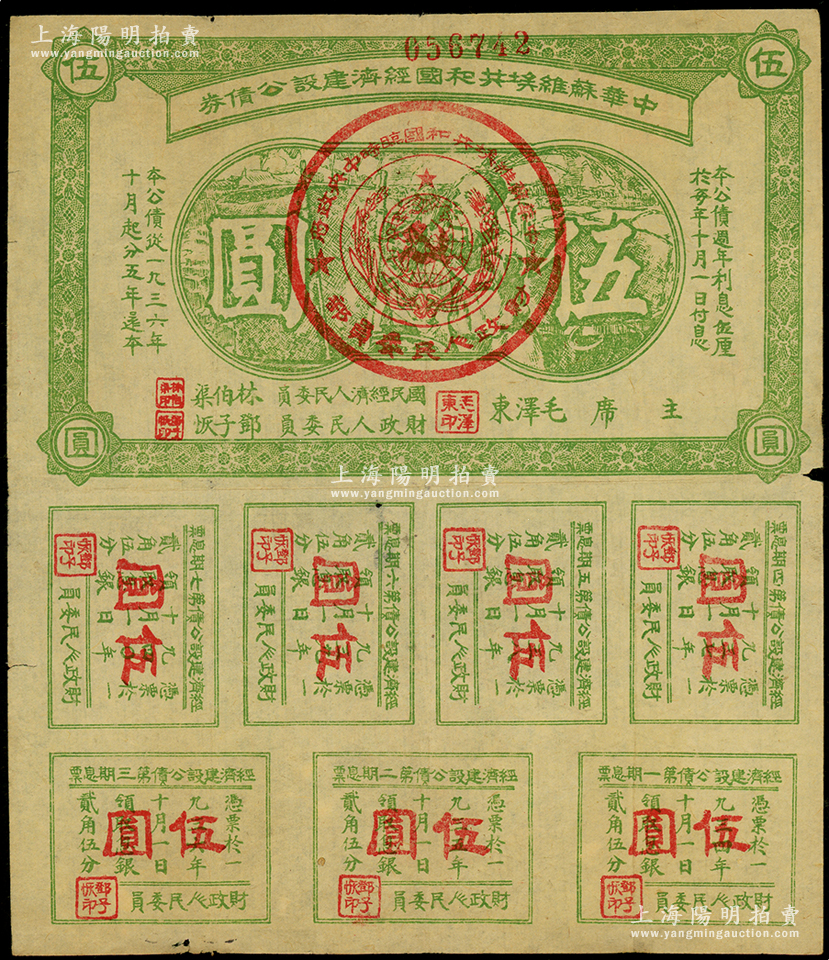 1936年中华苏维埃共和国经济建设公债券伍圆,由毛泽东、林伯渠等署名发行,原票七五成新