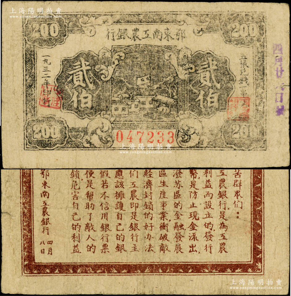 1932年鄂东南工农银行贰伯,背印劳苦群众告示;海外藏家出品,原票近八成新