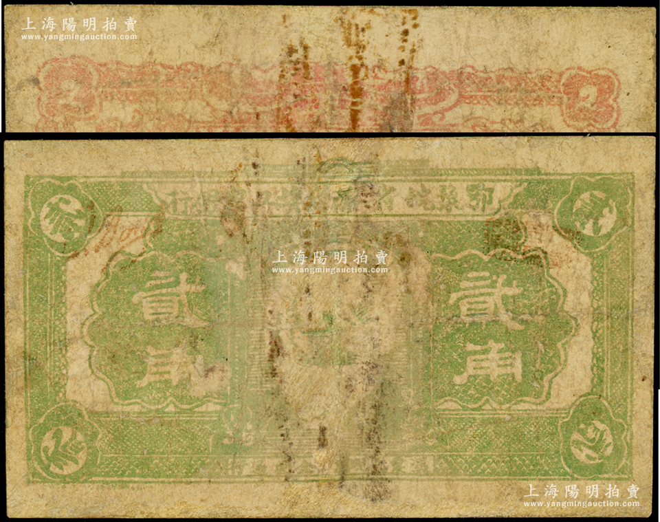 鄂豫皖省苏维埃工农银行(1932年)贰角,正面印马克思头像,背印地球图及“争取全国苏维埃胜利”之口号,由皖西北印刷局印制,有修补,近七成新,敬请预览