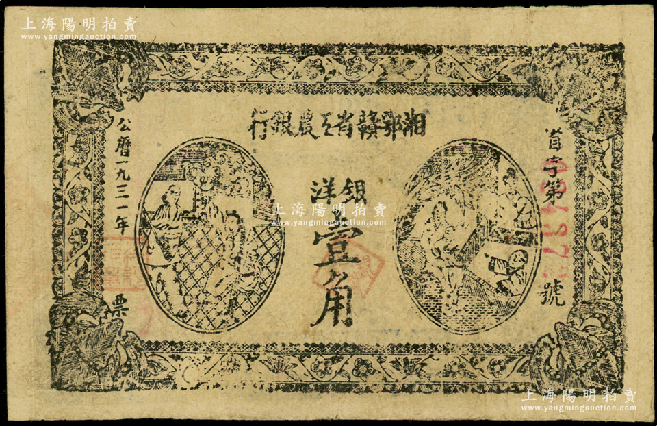 1931年湘鄂赣省工农银行银洋壹角,黑色冠字“省”;资深藏家出品,原票八成新