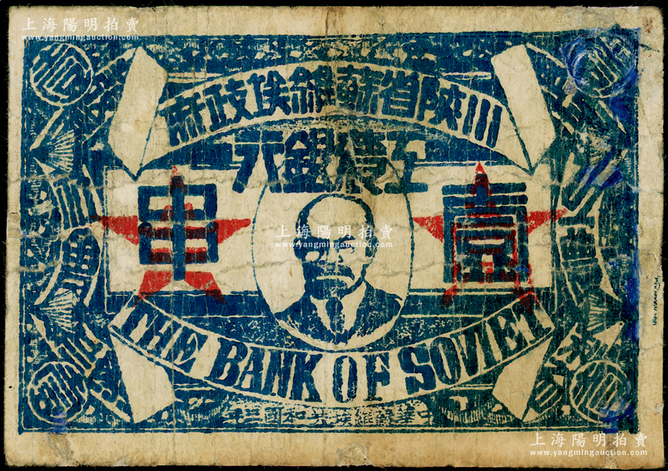 中华苏维埃共和国三年(1933年)川陕省苏维埃政府工农银行壹串,正面印列宁像,极富时代特色,少见,有修补,六成新,敬请预览