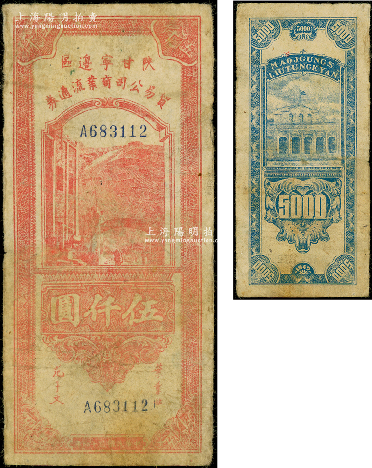 民国三十六年(1947年)陕甘宁边区贸易公司商业流通券红色伍仟圆,少见,原票七成新