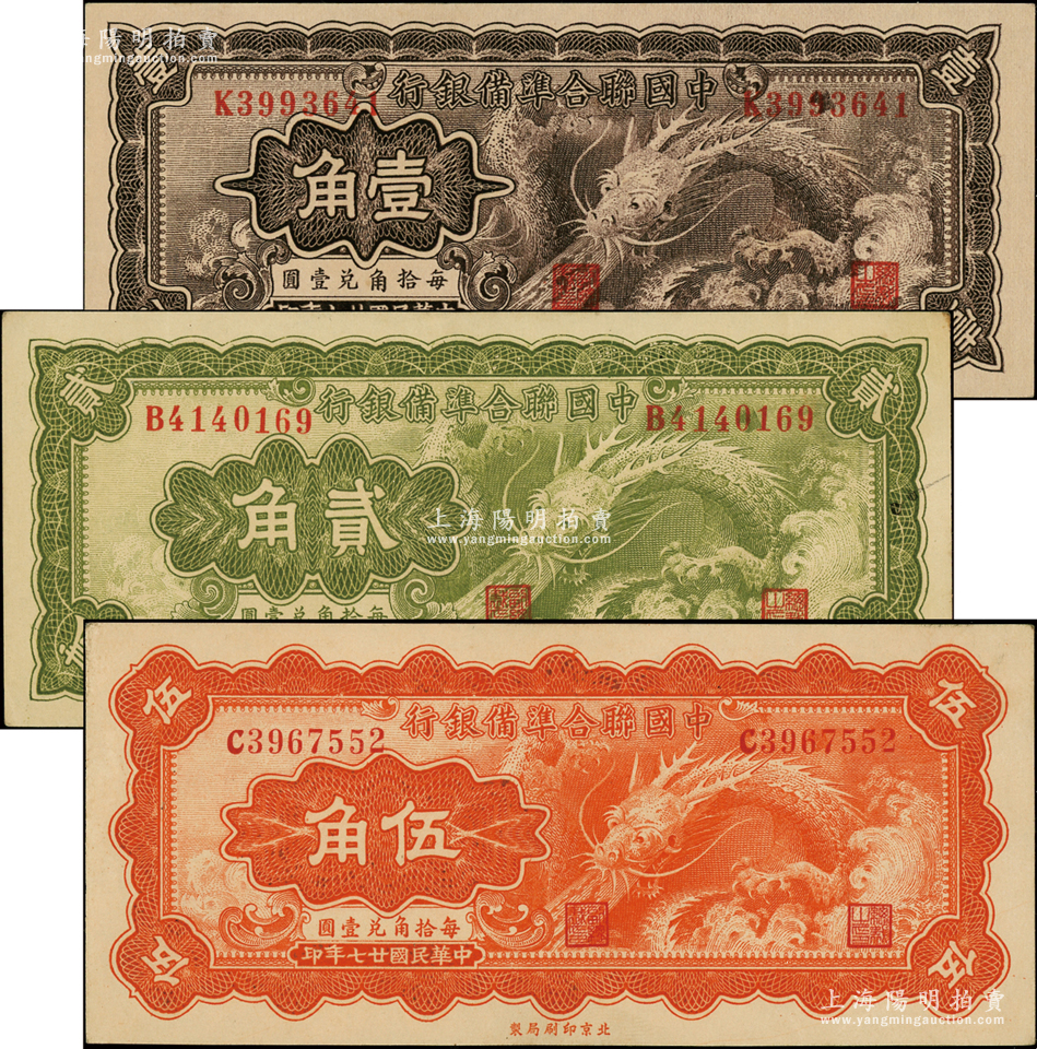 民国廿七年(1938年)中国联合准备银行小龙壹角、贰角、伍角共3枚全套,源于前辈名家之遗藏,未折九五至全新