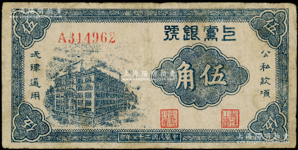 民国二十七年(1938年)上党银号伍角,山西革命根据地纸币,有修补,七成新