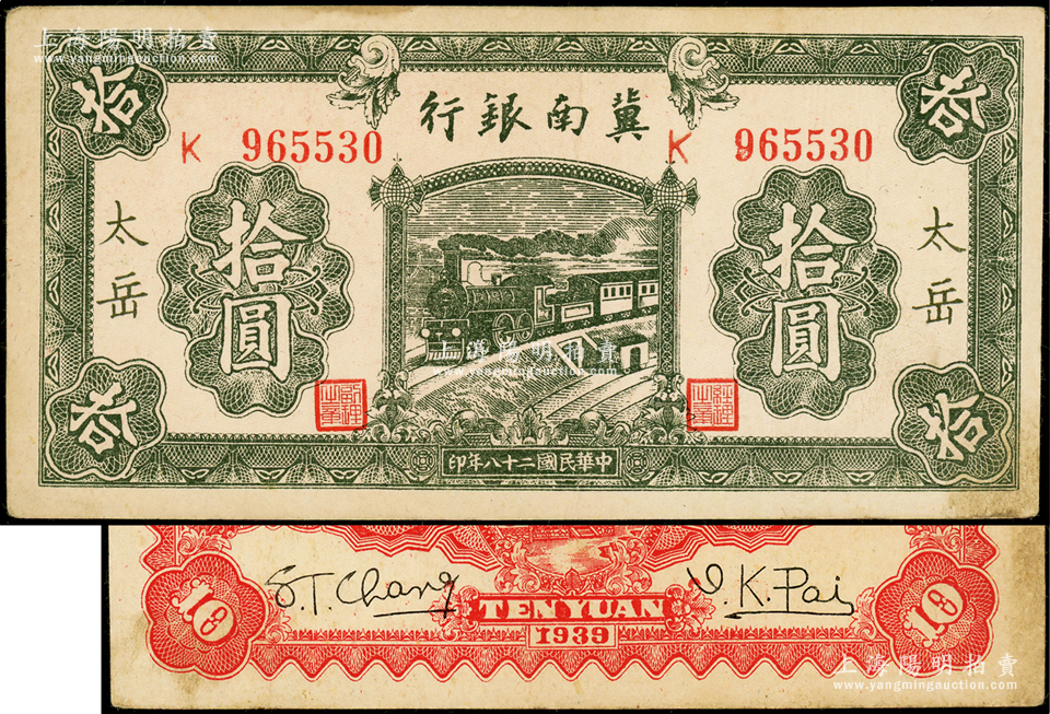 民国二十八年(1939年)冀南银行绿色拾圆,太岳地名(通常所见均为无地名券);资深藏家出品,少见,原票八五成新