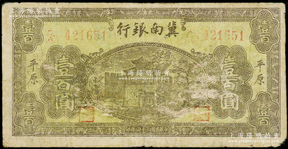 民国三十四年(1945年)冀南银行棕黄色楼阁图壹百圆,“平原”地名,属珍罕品种;资深藏家出品,原票七成新