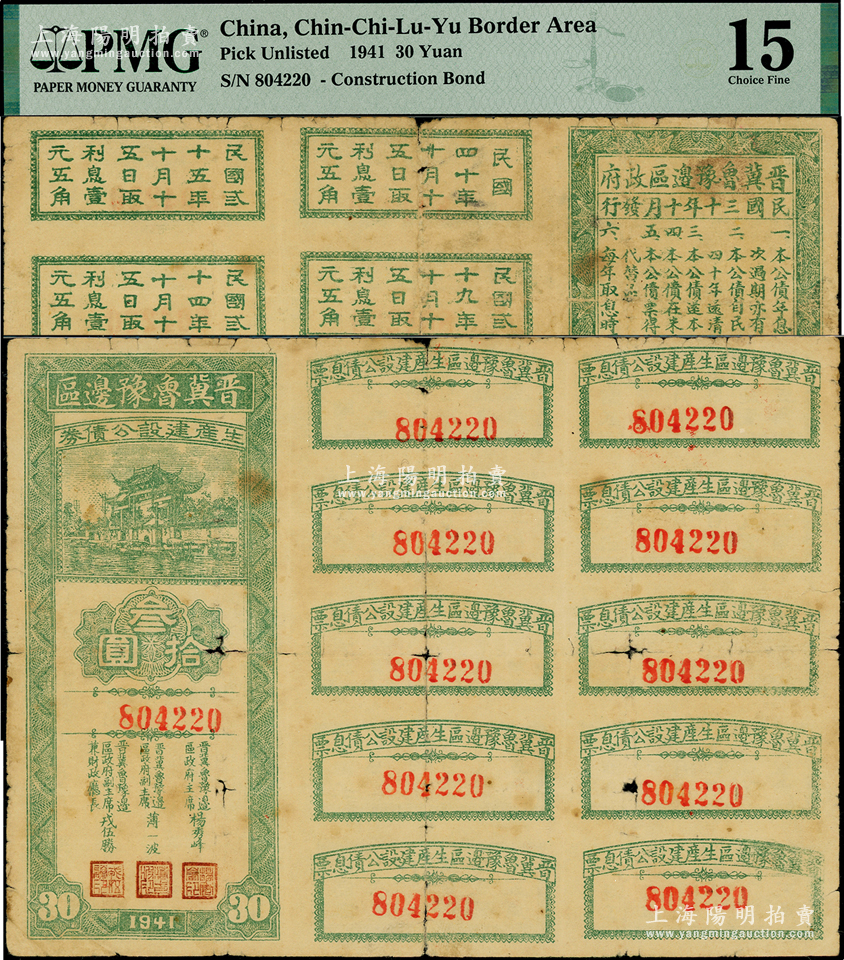 1941年晋冀鲁豫边区生产建设公债券叁拾圆,附带完整息票,属解放区债券,罕见,七成新