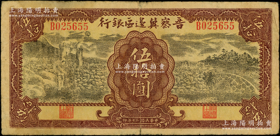 民国三十年(1941年)晋察冀边区银行打水与石桥图伍拾圆,属稀见品种,七成新