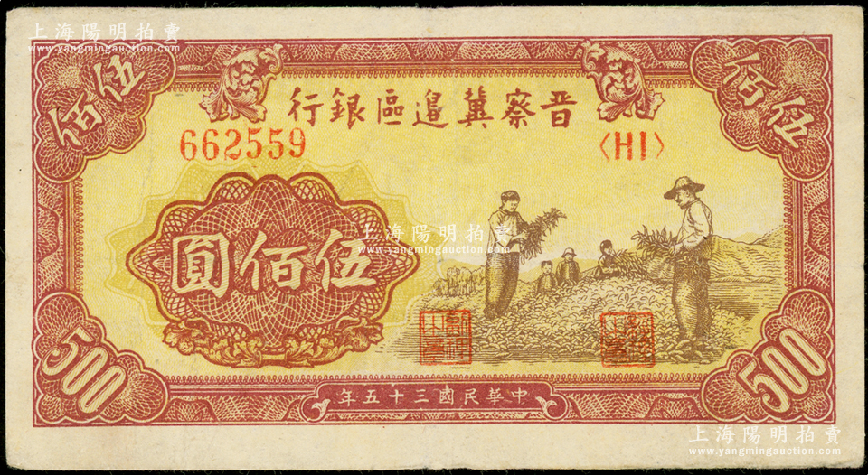 民国三十五年(1946年)晋察冀边区银行摘豆荚图伍佰圆,少见,八成新