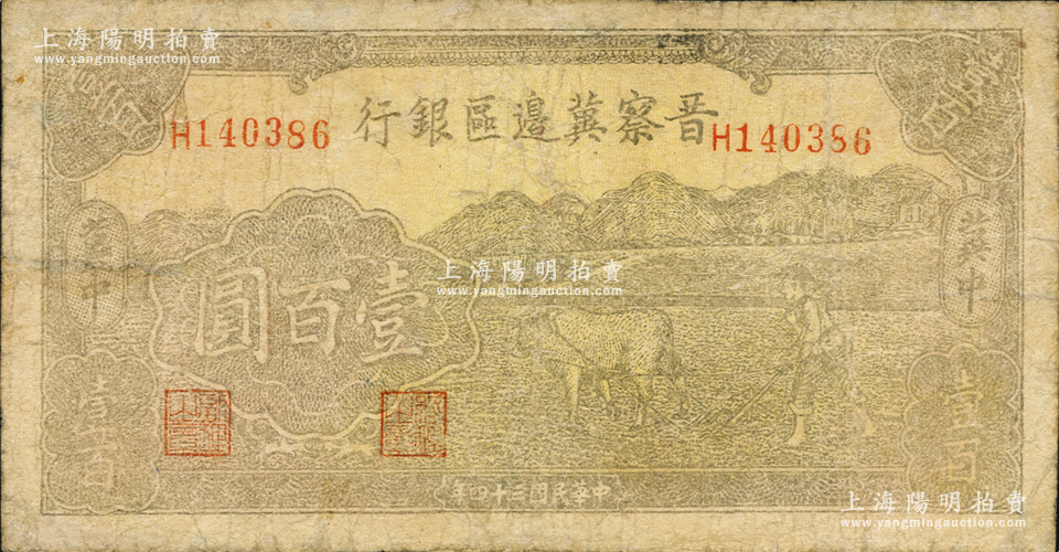 民国三十四年(1945年)晋察冀边区银行牛耕地图壹百圆,两边“冀中”地名,乃属晋察冀边区银行纸币之大珍品;资深藏家出品,边有小修,七成新