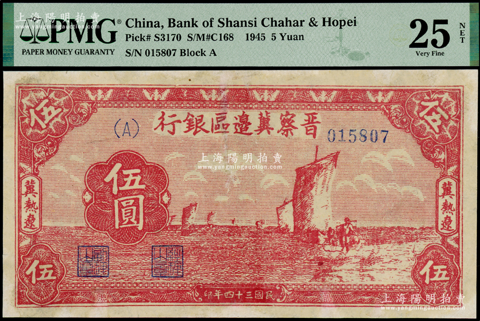 民国三十四年(1945年)晋察冀边区银行帆船图伍圆,冀热辽地名,少见,有修补,七五成新