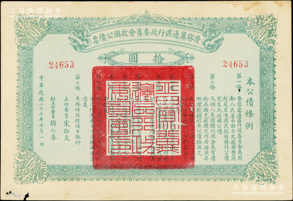 民国二十七年(1938年)晋察冀边区行政委员会救国公债票拾圆,此面额较为少见;资深藏家出品,近八成新