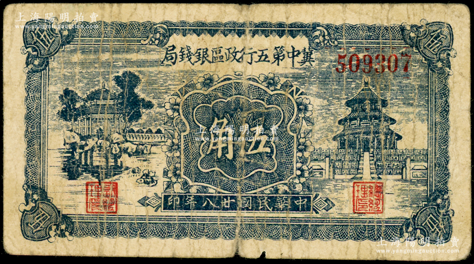民国廿八年(1939年)冀中第五行政区银钱局伍角,资深藏家出品,七成新