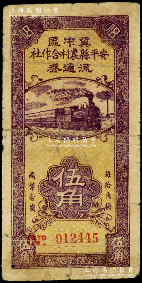 民国廿八年(1939年)冀中区安平县农村合作社流通券伍角,资深藏家出品,七成新