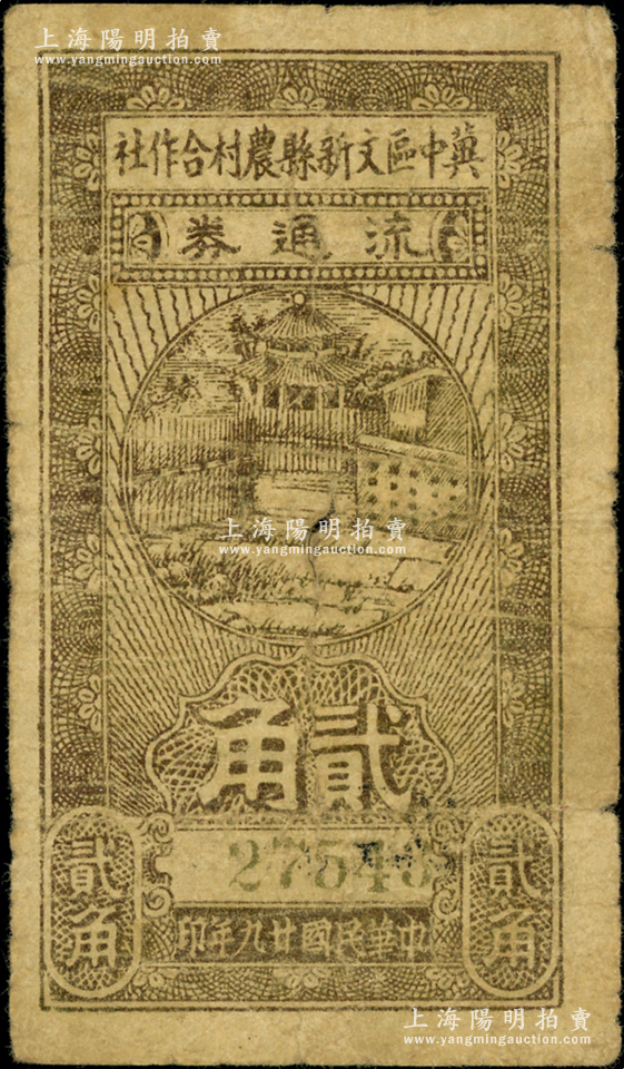 民国廿九年(1940年)冀中区文新县农村合作社流通券贰角,资深藏家出品,少见,七成新