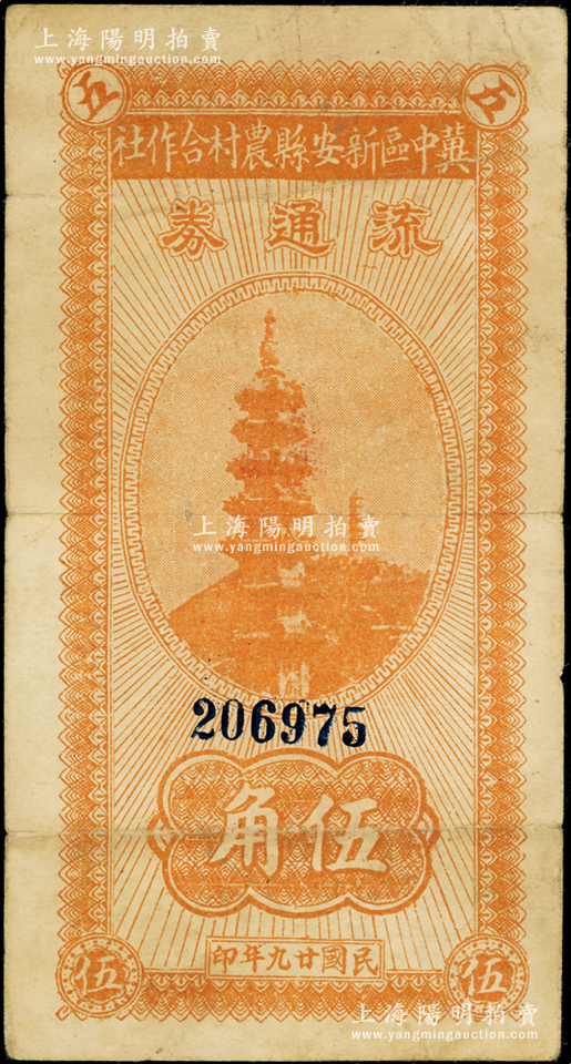 民国廿九年(1940年)冀中区新安县农村合作社流通券伍角,资深藏家出品,背有老式贴纸,七成新