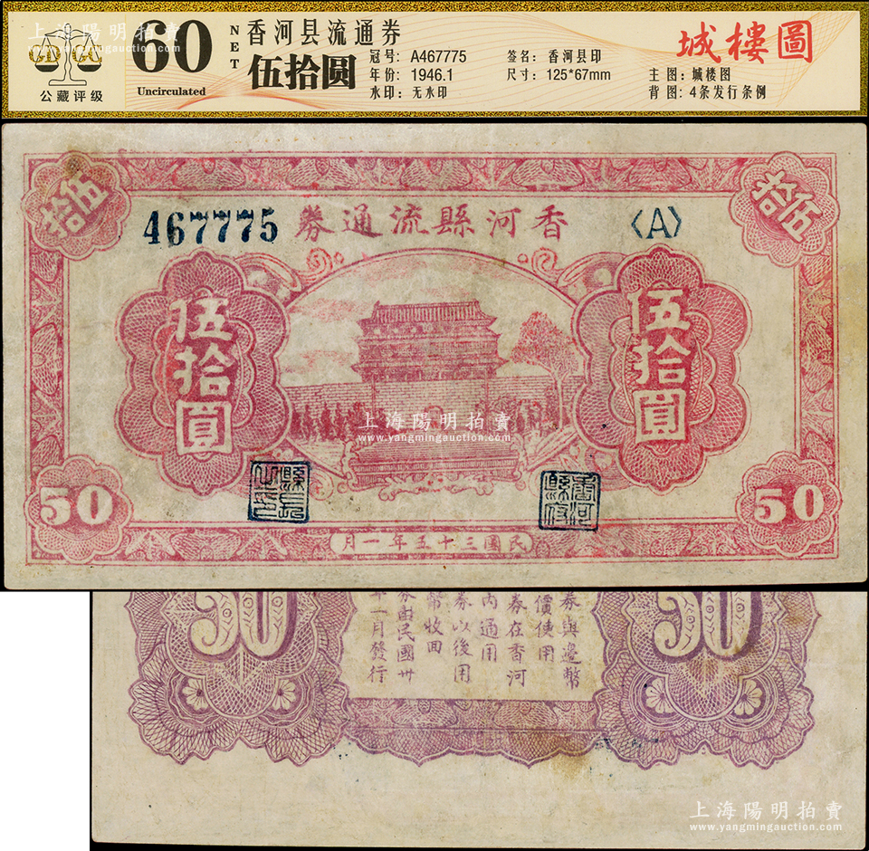 民国三十五年(1946年)香河县流通券伍拾圆,属冀热辽解放区纸币,与晋察冀边区银行等值流通;资深藏家出品,少见,有修补,近八成新