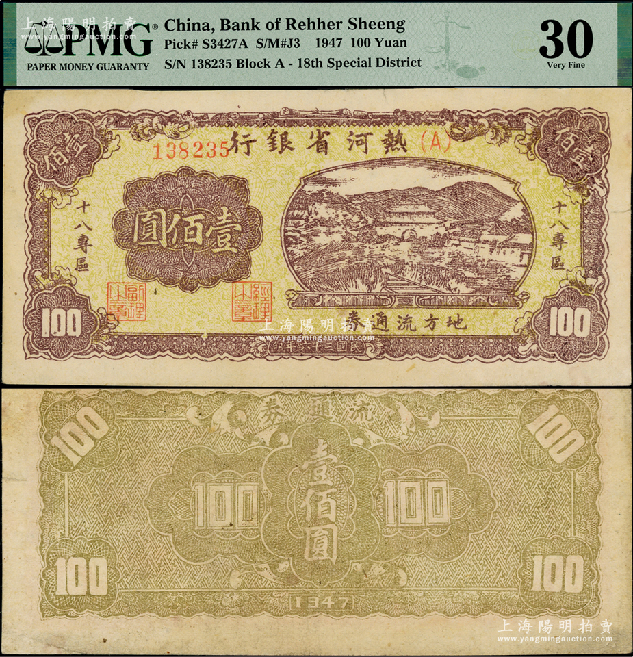 民国三十六年(1947年)热河省银行地方流通券山边城楼图壹佰圆,加印“十八专区”字样,罕见且品相甚佳,八五成新