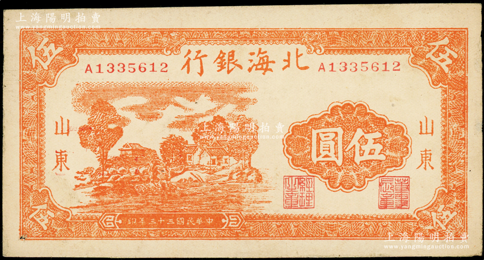 民国三十三年(1944年)北海银行桔色乡村房屋图伍圆,山东地名,A字轨(一般所见多为B字轨);资深藏家出品,原票未折九至九五成新