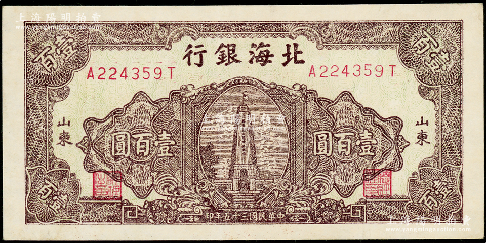 民国三十五年(1946年)北海银行绿底棕紫色纪念塔图壹百圆,山东地名,背印棕红色花纹;资深藏家出品,原票九五成新