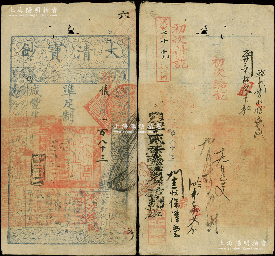 咸丰肆年(1854年)大清宝钞贰千文,仪字“183号”小号码,左边盖有满汉文“直隶等处承宣布政使司之印”大官印尤为清晰,年份下盖有“节以利度”之闲章,有背书十余处,且重新编号“农字2198号”等;源于前辈名家之遗藏,罕见,近八成新