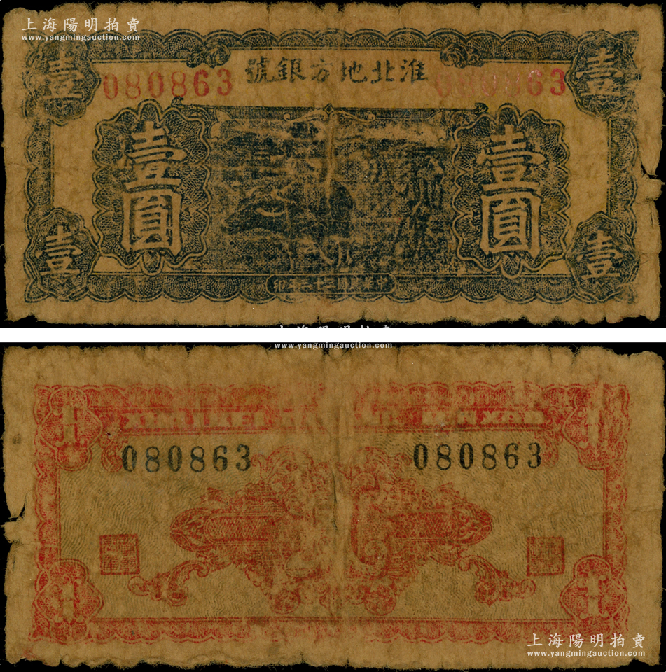 民国三十三年(1944年)淮北地方银号蓝色牛耕地图壹圆,乃属新四军抗币之珍罕品,原票近七成新