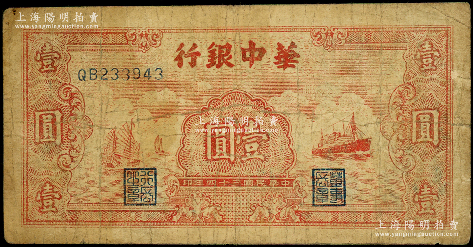 民国三十四年(1945年)华中银行红色帆船与轮船图壹圆,原票七成新