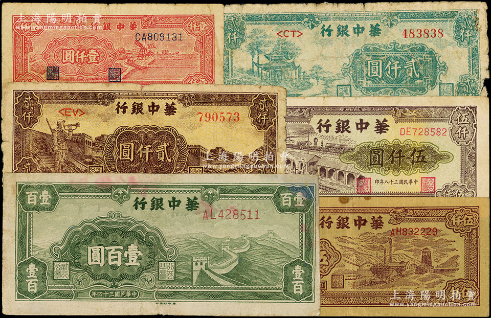 华中银行纸币6种,详分:1945年绿色长城图壹百圆,1948年红色风车图壹仟圆、绿色凉亭图贰仟圆、长城吹号图贰仟圆,1949年矿山图伍仟圆、码头图伍仟圆,六至七五成新,敬请预览