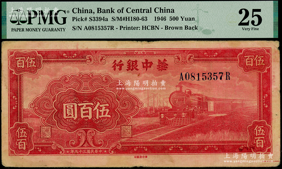民国三十五年(1946年)华中银行红色火车图伍百圆,背印轮船图;海外藏家出品,PMG 25 VF