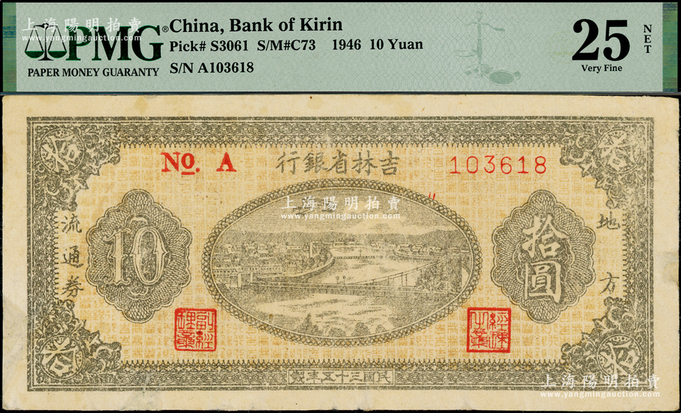 民国三十五年(1946年)吉林省银行地方流通券拾圆,细体号码版,有修补,PMG 25 VF NET