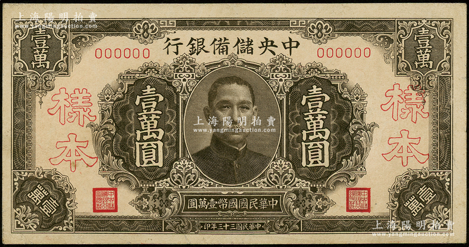 民国三十三年(1944年)中央储备银行褐色壹万圆样本,正背面合印;源于前辈名家之遗藏,九至九五成新
