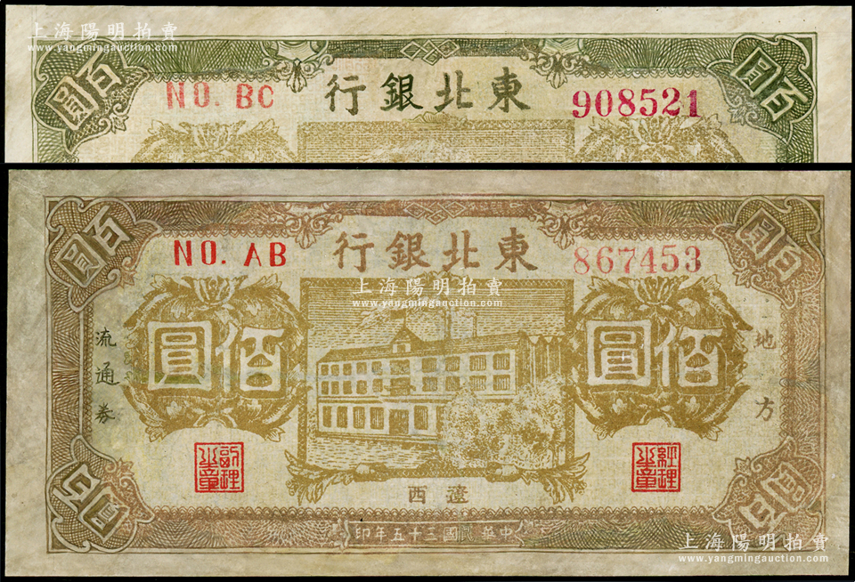 民国三十五年(1946年)东北银行地方流通券楼房图佰圆共2枚,辽西地名,其正背颜色各有不同,有修补,六至七成新