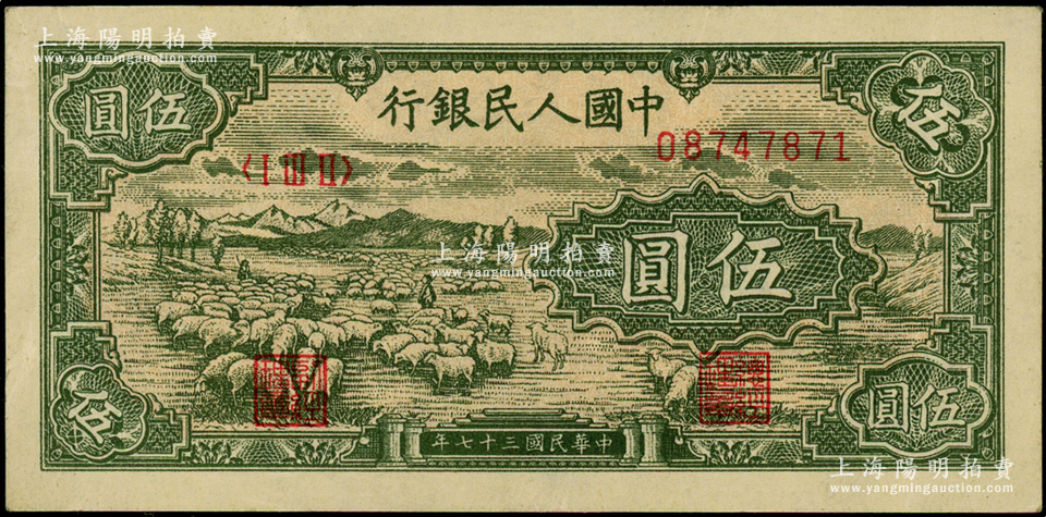 第一版人民币“绵羊”伍圆,源于前辈名家之遗藏,原票九至九五成新